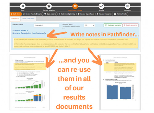 You can now write notes in the new Scenario description (for Customer) field (at the Cash flows & Goals step), and the notes will appear in any results document you download.